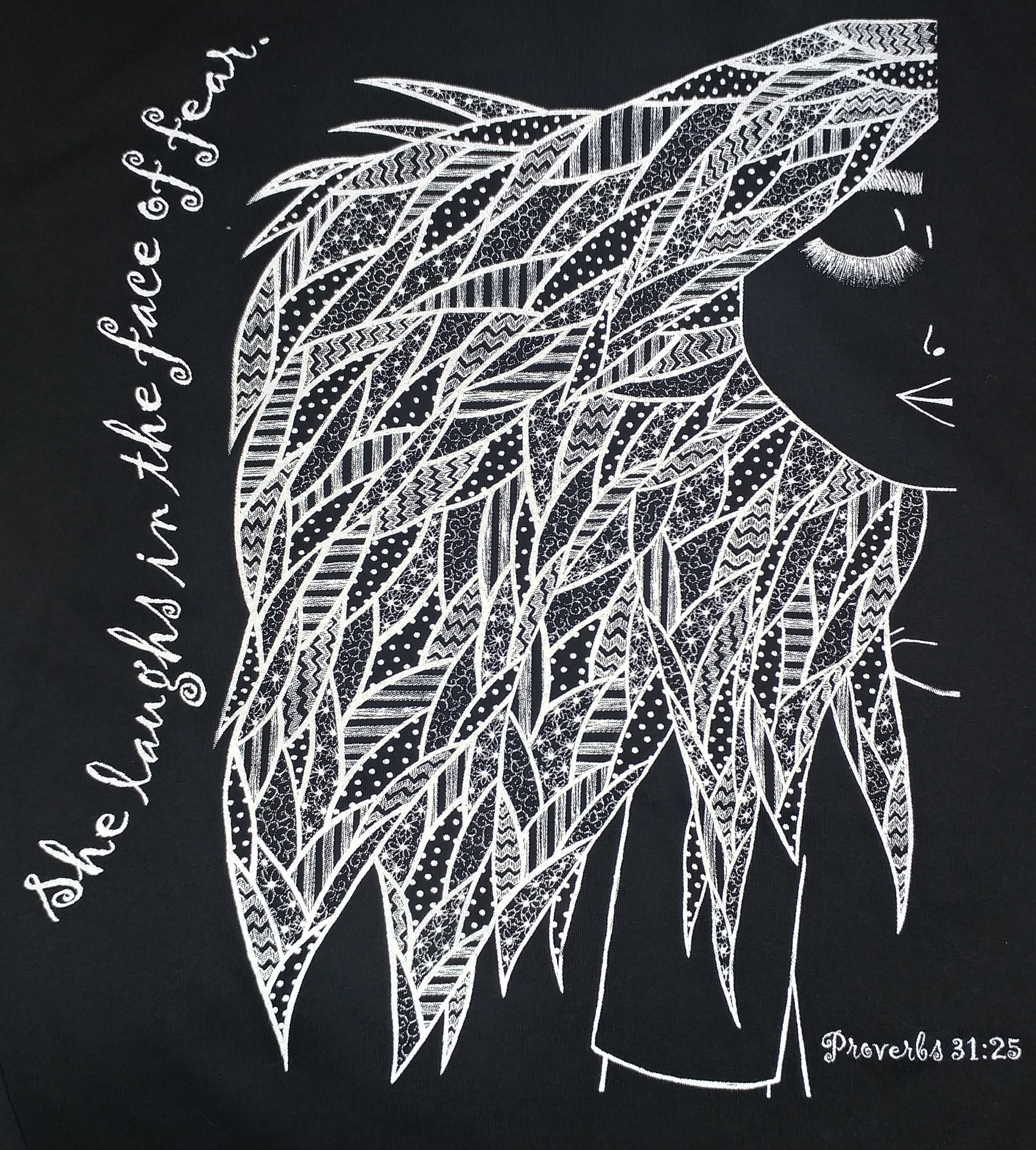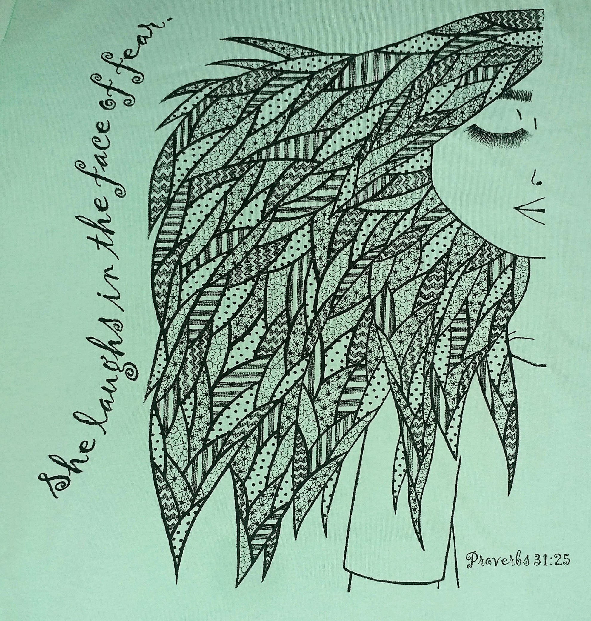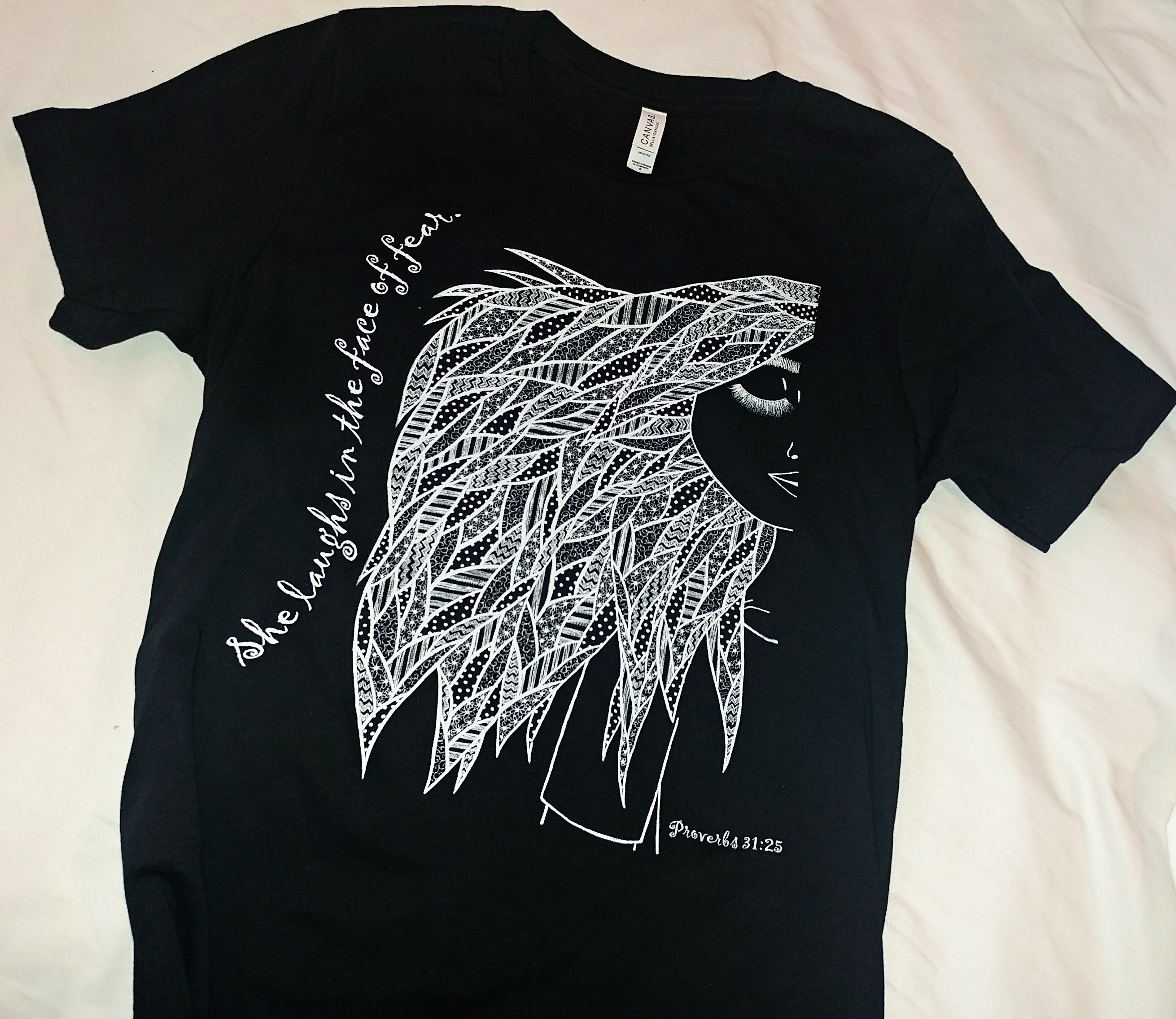 Hand sketched and inked, this shirt design is meant to inspire Proverbs 31:25 in the hearts of those who wear it: "She is clothed with strength and dignity, and she laughs without fear of the future."